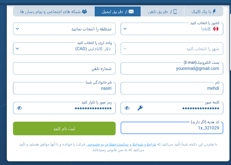 - Promo code: کد جوایز و تخفیفات می باشد که اغلب در بخش های مختلف سایت 1xbet قابل ملاحظه و استفاده می باشد که البته می توانید این بخش را نادیده گرفته و خالی بگذارید.