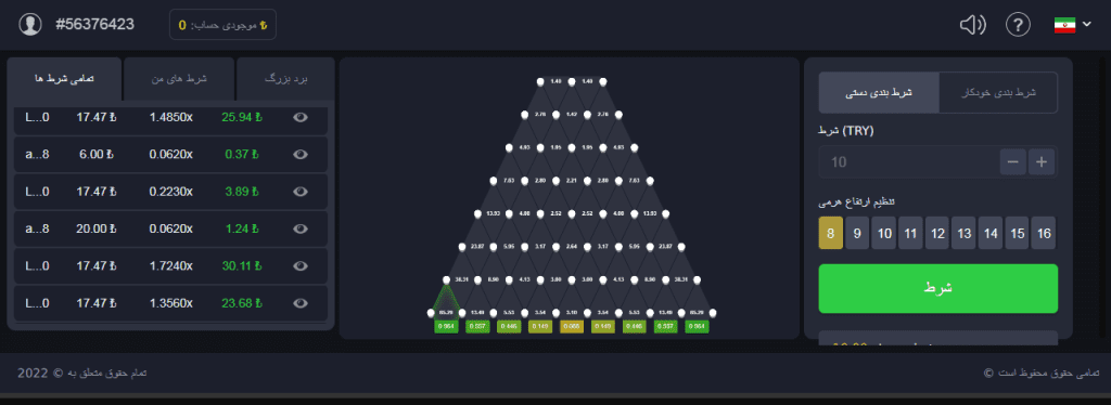 پس از انجام تنظیمات و تعیین مبلغ شرط، با کلیک بر روی دکمه “Play” یا “Bet”، توپ از بالای صفحه رها میشود. شما شاهد انیمیشن سقوط توپ و برخورد آن با میخها خواهید بود. این لحظه، اوج هیجان بازی پلینکو است.